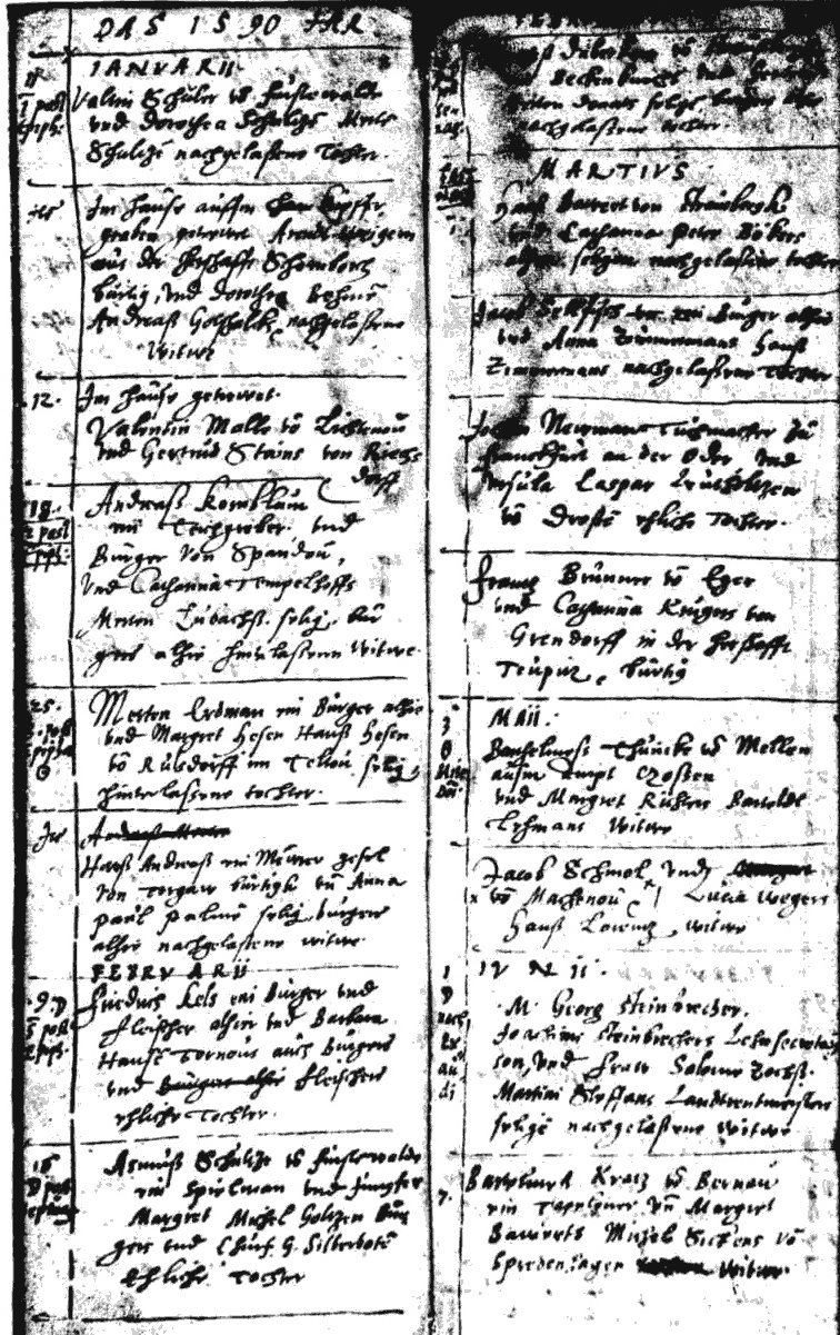 Trauerfeier und Leichenzug mit Auflistung von Teilnehmern anläßlich des Todes von Kurfürst Johann Georg von Brandenburg in dem Buch von Andreas Angelus (Engel) "Annales Marchiae Brandenburgicae", Frankfurt (Oder), Friedrich Hartmann, 1598 - Georg von Bruchwitz als einer der Teilnehmer bei der Trauerfeier des Kurfürsten, siehe Seite 448